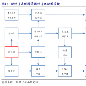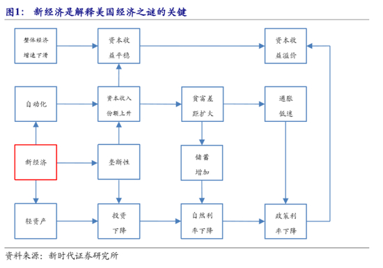 美国经济几个“谜”的答案可能都是新经济。虽然美国整体经济增速在下滑, 但是新经济的垄断性、自动化、资本增强型技术进步等特征,使资本对工人的议价能力增强,资本收入份额上升,最终导致资本收益率平稳。