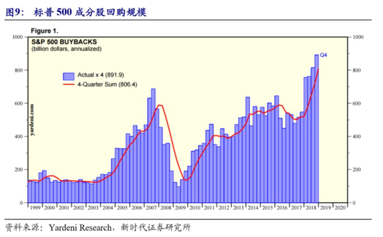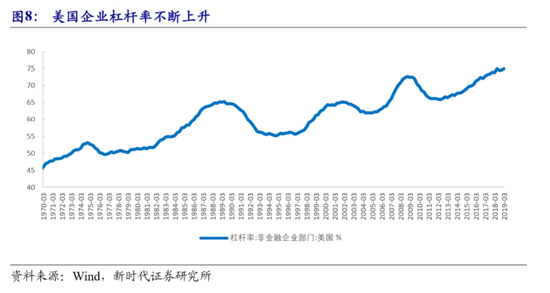 杠杆率上升主要是因为美国资金成本太低。融资获得的大部分资金没有用来增加投资,而是用于回购股票、支付股息。标普500 成分股公司股票回购规模自2009年的不到2000 亿美元不断上升到了2018 年的8064 亿美元。这可以推升股价,提高股东的投资回报率,还可以改善一些财务指标,增加股票吸引力。特朗普减税的效应也类似,虽然2017 年特朗普政府启动了里根政府以来的最大规模减税,但是企业增加的利润很大一部分是用来分红和回购股票,当然也有一部分用于投资。
