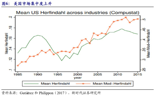 企业投资率下降和新经济密切相关。一方面,不同于重工业,轻资产特征导致新经济不需要那么多投资。另一方面,新经济“赢者通吃”特征比较明显,整体市场的垄断性增强,企业进入率和退出率下降,由于竞争受限,企业通过扩大投资争夺市场份额的动机减弱。垄断形成之后,企业更愿意提高价格,来获得利润,扩大新产品产能的必要性也下降。