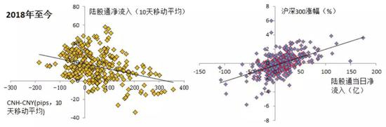 二是陆股通资金净流入与 CNH-CNY价差有明显的负相关关系,即陆股通净流入更多时,CNH-CNY的数值更小,也就是CNH相对CNY更偏向升值。