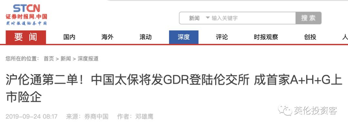 2019年9月23日,中国太平洋保险(以下简称“中国太保”)发布公告,宣布将发行全球存托凭证(Global Depository Receipts ,GDR)并登陆伦敦证券交易所,成为第二个通过“沪伦通”在伦交所主板上市的中国企业。
