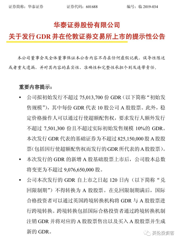 2019年6月11日晚间,华泰证券发布公告称,将在伦敦证券交易所发行不超过7501.37万份的全球存托凭证(Global Depository Receipts,简称GDR),其中每份GDR代表10股公司A股股票。