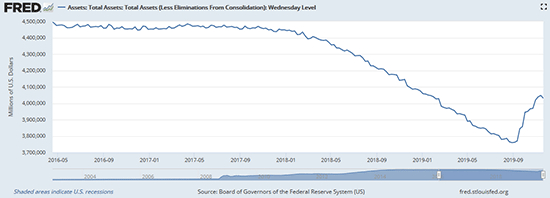 鲍威尔的理由是采取高压手段使回购市场“正常化”。市场将此解读为第四轮量化宽松,即QE4,尽管鲍威尔坚称这并不是量化宽松。美联储的资产负债表在9月中旬触及近3.85万亿美元的底部后,现在上升了7.4%,达到近4.1万亿美元。