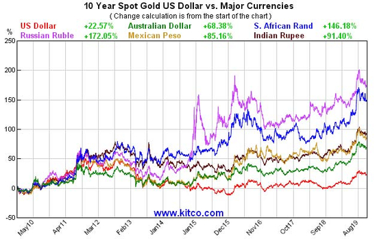 Krauth相信,有很多因素在推动黄金价格飙升。例如,美元逐渐不再是官方储备货币,人们还担心全球经济最终会放缓,股市和债市会达到峰值。