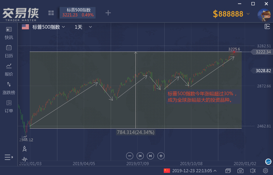 目前为止,美股仅在5月份和7月份收跌,连历年来表现最为疲软的8月也收涨。标普500指数录得自2013年以来最大的年度涨幅,而且是全球涨幅最大的投资品种。截至12月20日,标普500指数已经累计上涨超过30%,美股的另外两大股指也实现了年度大涨,道指涨23.40%,纳指涨37.16%。而现货黄金同期的涨幅为15.87%,美股的涨幅几乎是黄金的2倍。