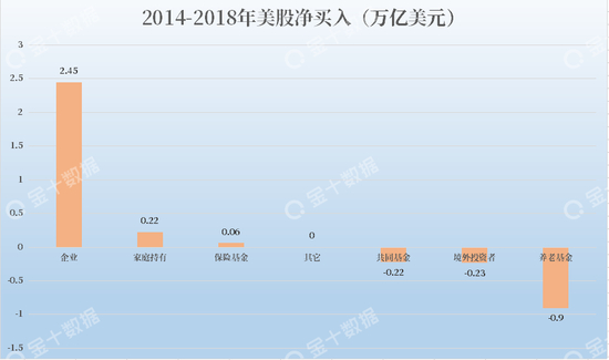 高盛的一项统计显示,2019年标普500指数成分公司回购股票的总价值将超4800亿美元,今年的股票回购总额有望创造史上第二高纪录,达到7100亿美元,这成为美股牛市重要的支撑力。其实从2014年开始,美股回购一直是支撑美股上涨的动力,如下图所示,在2014年-2018年期间,几乎100%的美股净购买量都是来自美国企业的股票回购,高盛更将其称之为“最大的股票需求来源”。