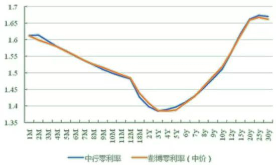 根据上述方法构造出的零息曲线与彭博终端给出的零息曲线基本吻合,各期限利率差值基本位于0~1BP之间,如图2所示: