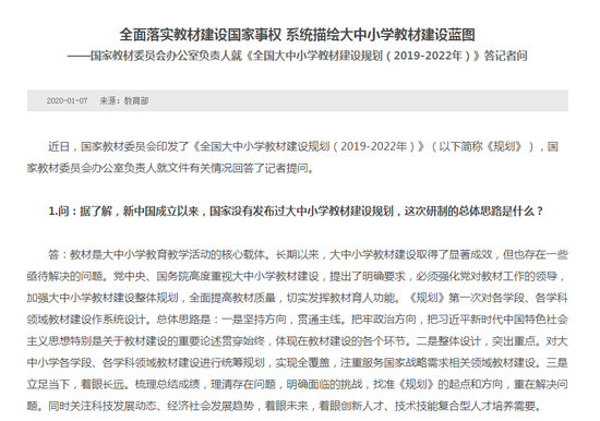 ——国家教材委员会办公室负责人就《全国大中小学教材建设规划(2019-2022年)》答记者问