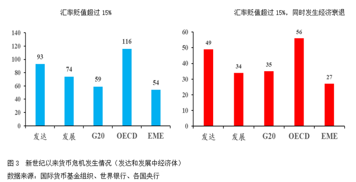 货币危机对于发达和发展中经济体都是普遍现象。传统上认为,货币危机往往是发展中经济体的“专利”;但新世纪以来的货币危机,改变了这个传统认识。研究发现,按单因素标准,新世纪以来全球167次货币危机中,发达经济体发生了93次,发展中经济体发生了74次;按双因素标准,新世纪以来全球83次货币危机中,发达经济体发生了49次,发展中经济体发生了34次(见图3)。