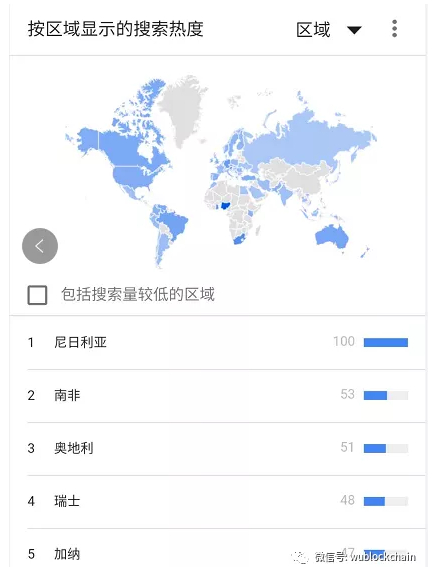 根据谷歌的搜索指数,尼日利亚已经在超过6个月的时间里,排名“bitcoin”搜索热度第一。而在前五名中有三个非洲国家。有数据显示,10.7%的南非人、7%到8%的加纳和尼日利亚人持有加密货币。