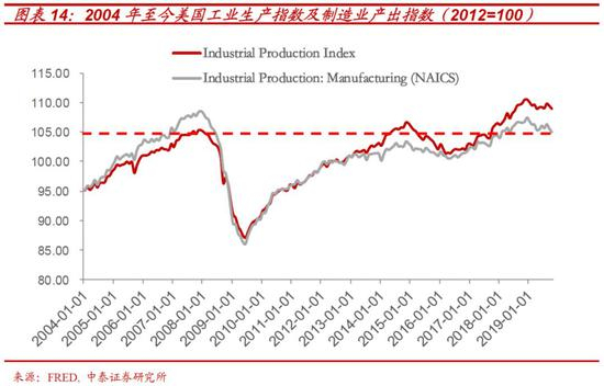 以制造业产出指数为例,过去十年,尽管美股整体涨幅已较08 年危机前的高点高出300%。但美国制造业产出水平较之危机前的2007 年11月依然低2%,工业总产出在过去12 年时间里一共才提升了4%。