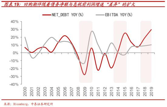 这其中,17-19年“牛市顶点”进行的高持仓成本加高利息成本的约1.9万亿美元回购,或成为后续“回购危机”的重要“导火线”。从各个时间段美国上市公司借债回购的金额可以看出,过去十年,美国公司借债回购的高峰主要是三个时间段:09-10年,13-15年以及17年-19年。在最近两轮回购潮中,都伴随着债务净额与息税前利润增速差异的走阔。这其中,09-10年,13-15年的上市公司大规模回购的背景是危机背景下联储趋于0的低利率,但17年—19年年中,在联储不断加息下,回购规模的持续扩大,则或主要由美股牛市本身的赚钱效应所致。