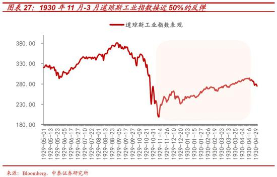 在1929年危机的第一阶段,市场因为杠杆资金踩踏和连环平仓引起的流动性危机,经历多次单日跌幅达10%以上的“黑色星期×”。这期间,尽管有美联储的降息举措(6%降至5%),流动性注入(1亿美元)以及企业家协会自发回购及护盘等触发的多个短期5%左右单日反弹,但整体下跌幅度仍接近50%。但在此之后的,1930年1-4月,美股却迎来了持续时间超过一个季度,涨幅近48%的第一轮大幅反弹。
