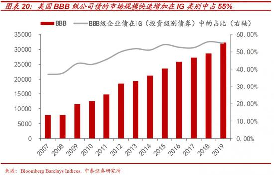 从数据上看,美国BBB级公司债的市场规模从2008年初的7269亿美元增至2019年的3.2万亿美元,在投资级债券中的占比超过55%。