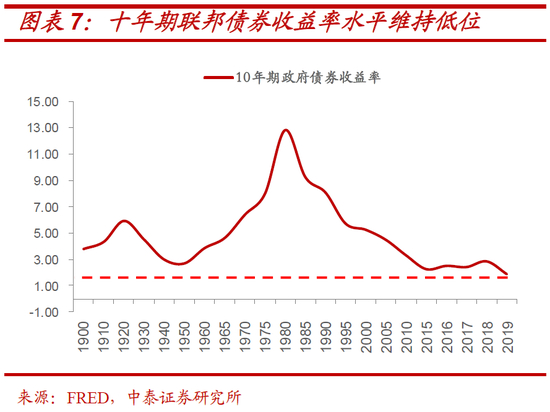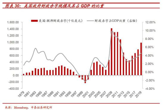 根据2019年年中,美国债务管理办公室对美国年度公共债务发行的最新预测:从2024年基本赤字降为零开始,美国新发行的公共债务所筹的资金就将全部用于支付已有债务产生的净利息,其规模介于7000亿到1.2万亿美元或更多。这一脆弱的财政基础,使得美国进一步通过激进财政政策刺激经济的路径并不现实。