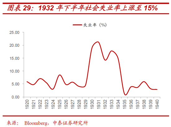 相应地,大萧条中对经济和市场伤害最大,最为痛苦的阶段,也均离不开国会因对赤字率的控制,而做出收紧性质的财政政策(尽管相应时期利率仍处于历史最低水平)。由于胡佛总统所在共和党在1930年的中期选举中丢掉了国会多数席位,使得财政政策始终“受制于人”,加之其本人对财政的认知并不清晰。1932年6月国会通过的《税收法案》,一方面,上调了包括所得税、公司税、消费税在内的多种税收,一方面,削减联邦开支,以图实现预算平衡。但结果却使得1932年下半年经济极端恶化,消费者支出和工业生产降幅超过20%,失业率上涨至15%以上,且伴随银行倒闭数量不断攀升。