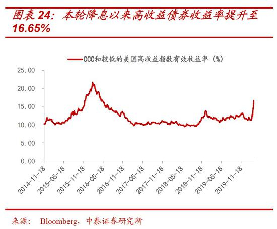 同时,疫情对资本市场及经济的冲击,显著降低了投资者的风险偏好,信用利差会持续扩大,这将进一步加大低评级债务企业资金成本、融资难度和还款压力。自2月中旬以来,尽管美联储已降息150bp,美国高收益债券收益率却从11.25%提升至16.65%,BBB级公司债的期权调整价差(OAS)从135上升至290bp。