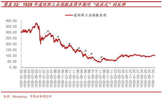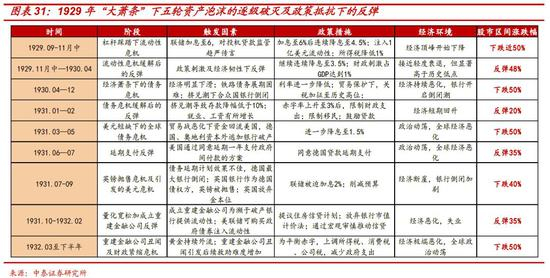 从危机演进过程看,参考1929年大萧条,危机不是一蹴而就的,而是经历了全球资产泡沫逐级爆破的五大阶段。每个阶段之间,政策的抵抗和投资者对短期因素的放大,都造就了平均近30%的五轮季度级别的大反弹,而每轮反弹之后,伴随经济基本面的进一步恶化和新风险的引爆都会造成新一波更猛烈的下跌。