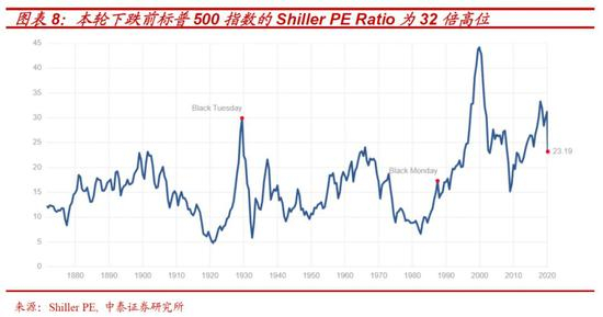从估值角度看,以标普500指数的Shiller PE Ratio(按通胀率调整过去十年的利润与股价相比)在本轮下跌前其为32倍左右,超过2008年金融危机的26倍,与“大萧条”前1929年的30倍相当,属于历史高位区间。即使目前指数下跌幅度已超过30%,当前23.20倍的估值水平,仍处于60%的历史分位数水平(如果考虑我们后文详细描述的回购对每股盈利的“粉饰”,则估值及其历史分位数水平会更高)。也就是说,即便经历四次熔断,美股整体目前也很难说,估值绝对便宜。