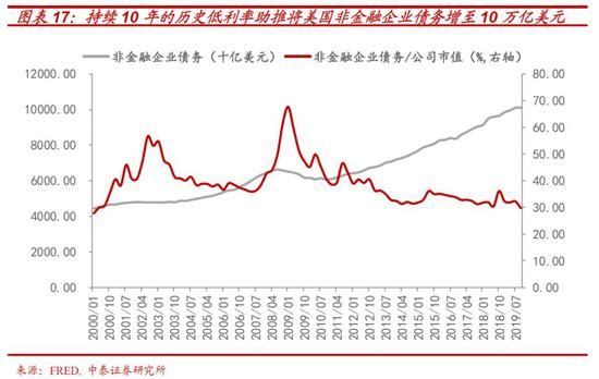 1)从数据上看,持续近10年的低利率,将美国企业债务总额推高至近10万亿美元,非金融企业债务占GDP比重也超过74.4%,这一比重高于2008年房地产泡沫顶峰时的72%。