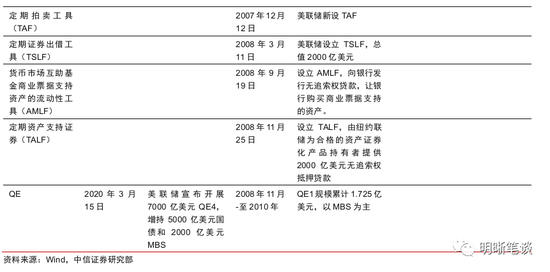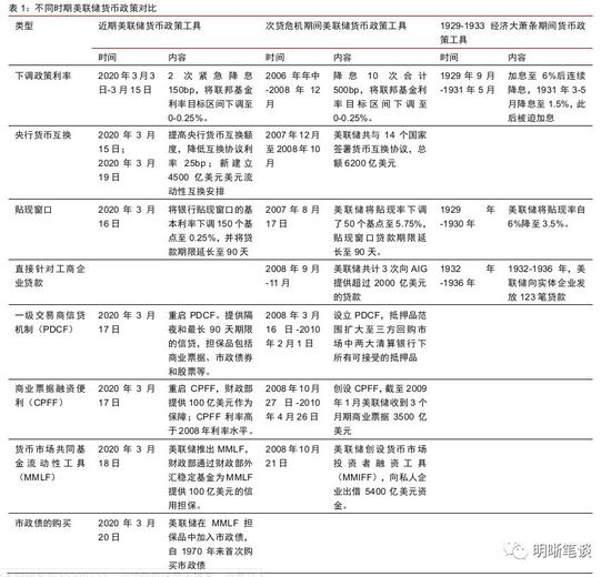 不同时期的美联储货币政策:近期美联储的货币政策工具包括降息、QE、贴现窗口、准备金、正回购、一级交易商信贷机制(PDCF)、商业票据融资便利(CPFF)、货币市场共同基金流动性工具(MMLF)、央行货币互换,大部分是2008年次贷危机货币政策工具的重启,但货币政策工具的规模、内容等存在区别。