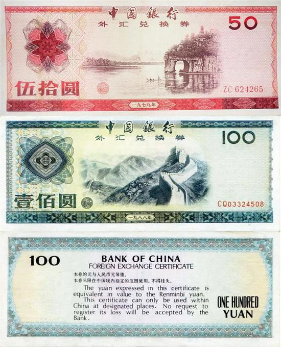 外汇券(Foreign Exchange Certificate)全称“中国银行外汇兑换券”,俗称“外汇兑换券”“外汇券”,是由中国银行发行,曾在中国境内流通、在特定场合使用,面额与人民币等值的一种特定货币,分为1979年和1988年两个版本,共有7种面额:100元、50元、10元、5元、1元、5角、1角。外汇券正面为中国的风景名胜和中文“中国银行外汇兑换券”的字样及金额;背面则为英文“BANK OF CHINA FOREIGN EXCHANGE CERTIFICATE”和中英文字“本券的元与人民币等值。本券只限在中国境内指定范围使用,不得挂失”的字样及金额。外汇券完美的设计构想、独特的雕刻绘画风格都有很高的艺术价值。外汇券纸质优良,印制精美,“中国银行”潇洒秀美的几个字又出自书法大家郭沫若之手,票面图案表现的都是祖国的美丽山河。