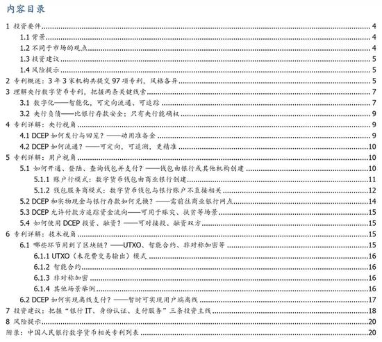 DCEP在交易安全、应用开发等方面的机会不容忽视。市场认为,DCEP产业链的投资机会只在身份认证、支付服务等领域。我们认为,交易安全、应用开发等方面的机会同样不容忽视。例如,由于DCEP比商业银行存款安全性更高,但面值相同,坊间可能形成有关DCEP的场外市场,这一风险值得重视。另外,根据央行数字货币研究所所长姚前等领导的论述和央行有关专利,DCEP或将参与撮合投融资或其他应用场景,厂商需高度关注此类机会。