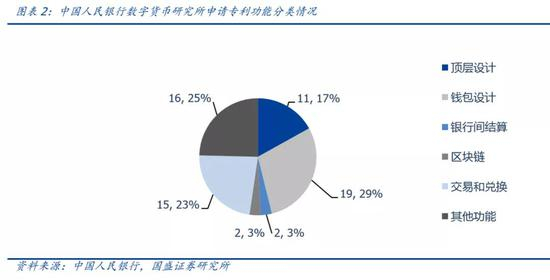 从功能分类来看,中国人民银行数字货币研究所的专利多集中在顶层设计(11项)、用户层面上(34项),其中交易兑换15项、钱包设计19项,占到了总专利数量的69%,还分别有两项设计和银行间结算、区块链相关,还有一些专利与身份管理等技术相关。