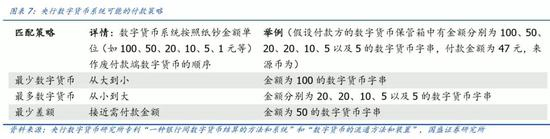 DCEP交易的具体方式取决于字符串预设匹配规则,预设匹配规则可以是最多数字货币策略,也可以是最少数字货币策略,或者是最少差额策略,最少差额策略还可以与另外两种组合。