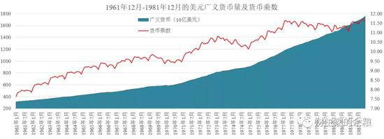 基本上保持着10年翻一番的速度,归根结底,1971-1982年的大滞胀是对美元1962年以来持续无锚印钞的反映,在整个社会货币乘数没有变小、甚至是在变大的情况下,基础货币数量的成倍增加,带来的当然只可能是通胀。