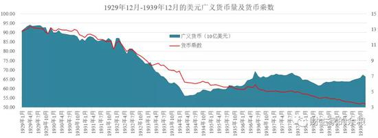 从1929年到1934年,美国的货币乘数从接近13一直下降到1939年的略高于3附近,而美元广义货币供应量从940亿美元下降到了1934年的580亿美元,下降比例高达40%,这就是大萧条发生的货币原因。