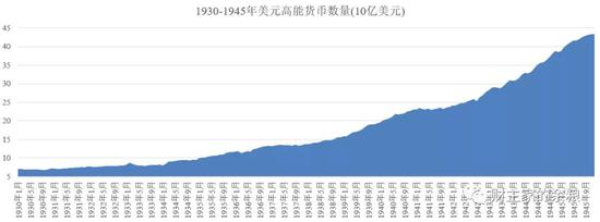 1941年,美国正式加入第二次世界大战,在联邦政府的压力之下,美联储开始无限量买入政府发行的国债。从1941年6月到1945年6月,联邦政府债务从480亿美元暴增到2350亿美元,美元的广义货币也从630亿元增加到1270亿元,这意味着美元印刷开始脱离黄金的束缚。