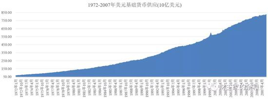 美元基础货币基本保持着一个稳定的增长率,其数量也由1982年底的1630亿美元,增加到了2007年底的8300亿美元——25年时间翻了5倍。