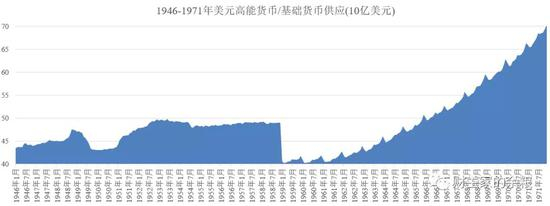因为黄金储备并没有继续大幅度增长,整体来看,第二次世界大战结束后,在大约15年的时间里(1943-1958年),美国高能货币/基础货币基本上没有什么大的变化,稳定在400亿美元左右。