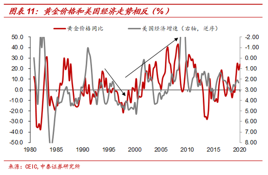 黄金作为一种天然的货币,它的存在就是来对抗人造纸币的超发的。当经济增长好的时候,央行也会发行货币,但购买的资产质量也是可以的,即发行的纸币对应的是有价值的,纸币是保值的,黄金就没有什么大行情。例如上世纪90年代,美国经济稳健增长,黄金价格一直萎靡。最近一波黄金的十多年大行情终结于2012年,而美国经济也正是在2012年之后企稳回升的。