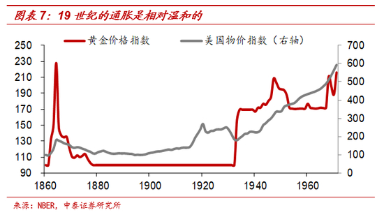 在1860年之后的40年时间里,美国物价水平只上涨了11%,年化通胀率不到0.3%,通胀速度是非常缓慢的。此期间的通胀上涨主要集中在了美国内战前后,当时黄金价格也大幅飙升,之后美国通胀和金价均大幅回落。