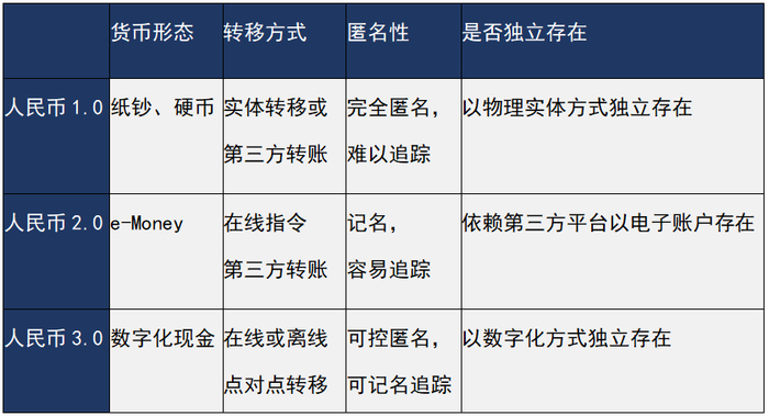 也就是说,数字货币具有实物货币(金、银、纸钞等)的特征与功能,只不过是数字化铸造发行的货币(Digital Currency),是一种新的货币形态。因此,人民币从纸币硬币、电子支付一路走来,到DC/EP脱胎换骨,成为“人民币3.0”。(人民币1.0指的是人民币现钞、硬币,人民币2.0指的是实现电子化支付与管理的人民币。)
