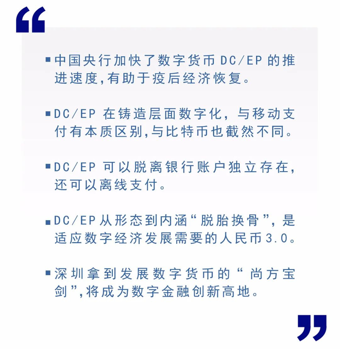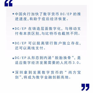 从长远来看,DC/EP将重新定义人民币的发行与流通,因此,不但将极大提高央行货币政策有效性,实现精准化、智能化,而且将为中国经济由出口主导向内需主导、由工业经济向数字经济转型提供相适应的金融基础支持。因此,对于人民币来说,DC/EP不仅仅是形态上的变化,而是经济转型为背景的内涵深化。这是从形态到内涵的“脱胎换骨”。