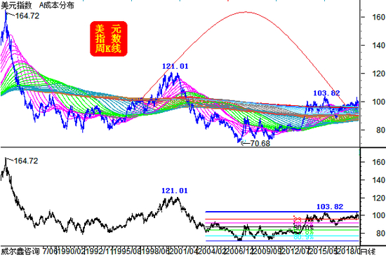 就数十年美元指数运行的“成本分布”观察,仍似第三浪顶部还没出现。如美元指数周K线图示: