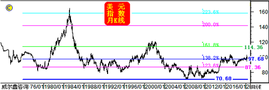 如果中周期美元出现一轮类似2014下半年对38.2%黄金分割位的突破,突破61.8%黄金分割位,理论目标可能会在哪里呢?图中的80.9%黄金分割位(理论点位111.40点)将是重要参考。