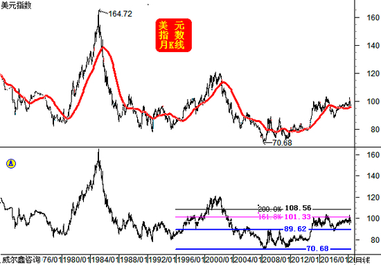 如果此轮美元牛市大周期的第三浪顶部未现,理论位置大概会在哪些点位呢?从美元指数整个50年大周期宏观波段164.72-70.68点观察,该超宏观波段反弹的38.2%黄金分割理论位在106.6点,笔者认为应该是后市中周期至少应该见到的点位。如果参考2001年前的第三浪形态,则不排除依然存在测试164.72-70.68点超宏观调整波段二分位在117.70点附近的可能。