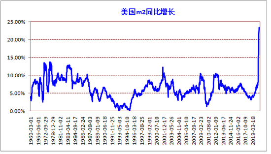 这幅图表还不足以反应投资者对2020年以来的美国货币投放感受。再如1960年至今的美国M2同比增量图示: