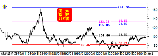 如果中周期美元出现一轮类似2014下半年对38.2%黄金分割位的突破,突破61.8%黄金分割位,理论目标可能会在哪里呢?图中的80.9%黄金分割位(理论点位111.40点)将是重要参考。