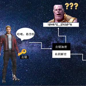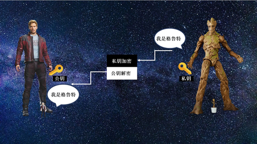 如何用这对密钥来发送信息呢?假设《银河护卫队》里的星爵想给格鲁特发送一条消息说:“哈喽,格鲁特”,但又要确保超级大反派灭霸不能读取这条消息,该怎么办呢?我们可以让格鲁特创建一对密钥,把公钥交给星爵,自己保管私钥。星爵可以用公钥加密信息,经过加密的信息看上去就像在胡言乱语,只有格鲁特用私钥解密之后才能知道星爵到底说了什么。