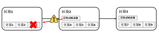 如果删除掉第一个区块中的交易3,那第2个区块中的哈希值就会发生变化,证明第1个区块中的交易信息被篡改了。