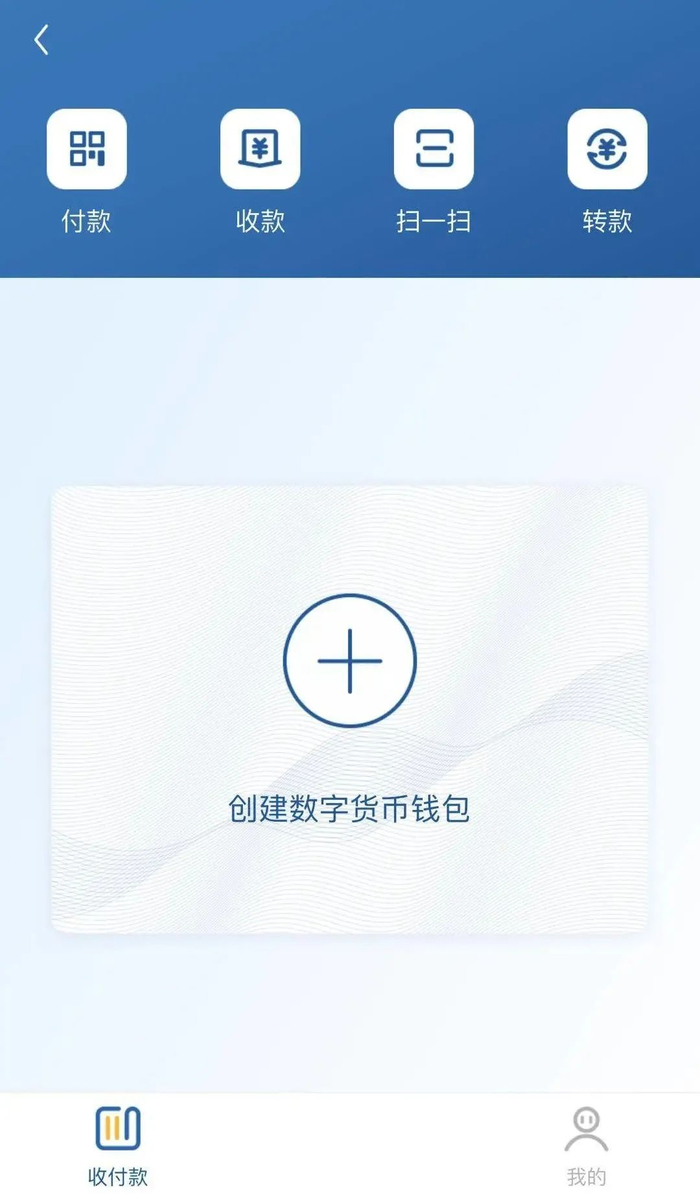 在“创建数字货币钱包”页面,有“付款”、“收款”、“扫一扫”、“转款”四个选项,下方位置分别有“收付款”和“我的”入口。