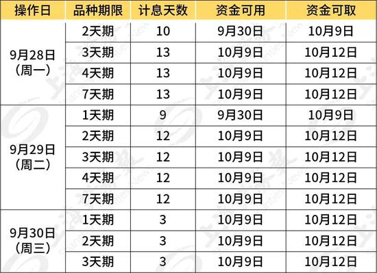 那么,具体怎样操作才最划算?结合今年“十一”放假安排,周二(9月29日)、周三(9月30日)就是卖出1天期逆回购的最佳时间,简简单单两次操作,就可以合计赚到12天的利息,还完全不影响股票交易。