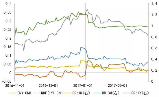 目前,金融市场上衡量人民币汇率预期的指标主要有三个,分别是在岸与离岸价差(CNY-CNH)、风险逆转期权以及人民币NDF。