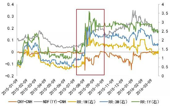 应该说三种预期指标从不同角度刻画了投资者的预期。通过观察历史上的走向,笔者发现三者有时候趋向一致。如图1所示,“8.11”改革引起的轩然大波在各个市场都有明显反应,风险逆转期权(RR)和NDF指标均呈直线上升,而CNY-CNH价差快速拉大,三种指标都表达了很强的贬值预期。
