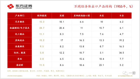 早在50年代末,德国就超过英国,成为欧洲最大的出口国。然而,汇率低估只是对外竞争力来源的一个方面,甚至并非主要解释。林德拉(2012)从世界贸易、结构和竞争力这三个因子对德国世界贸易份额增长的进行了拆分,认为世界贸易水平的增长和结构性因素是解释联邦德国出口增长更为主要的因素。从结构因素来说(表1),1948年,德国出口的一半以上是煤炭和木材,到1955年,农产品等初级产品在德国出口中的比重就已经很低,而具有价格刚性和高收入弹性的产品,如汽车制造、机械制造、电子技术、化工制品等占比不断提升。1955年,占德国总出口的一半,远高于北美的1/3,欧洲大陆核心国家的1/4和日本的1/6。1950至1973年,这些行业占联邦德国GDP的1/4。